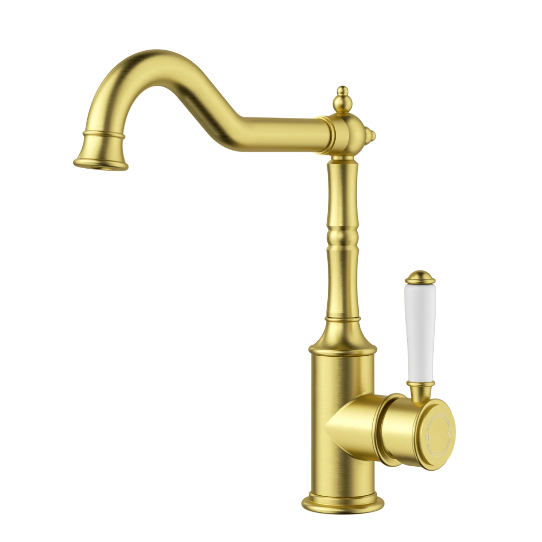 Clasico Hook Spout Sink Mixer | Brushed Gold Ceramic Handle