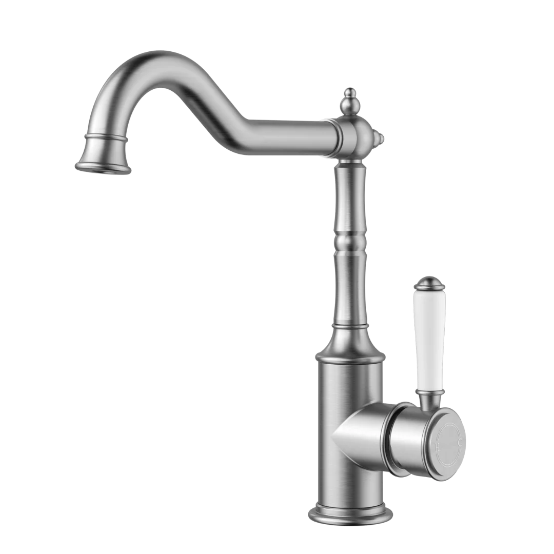 Clasico Hook Spout Sink Mixer | Brushed Nickel Ceramic Handle