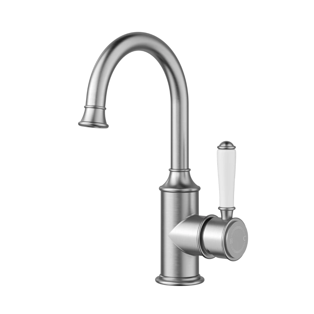 Clasico Gooseneck Basin Mixer | Brushed Nickel Ceramic Handle