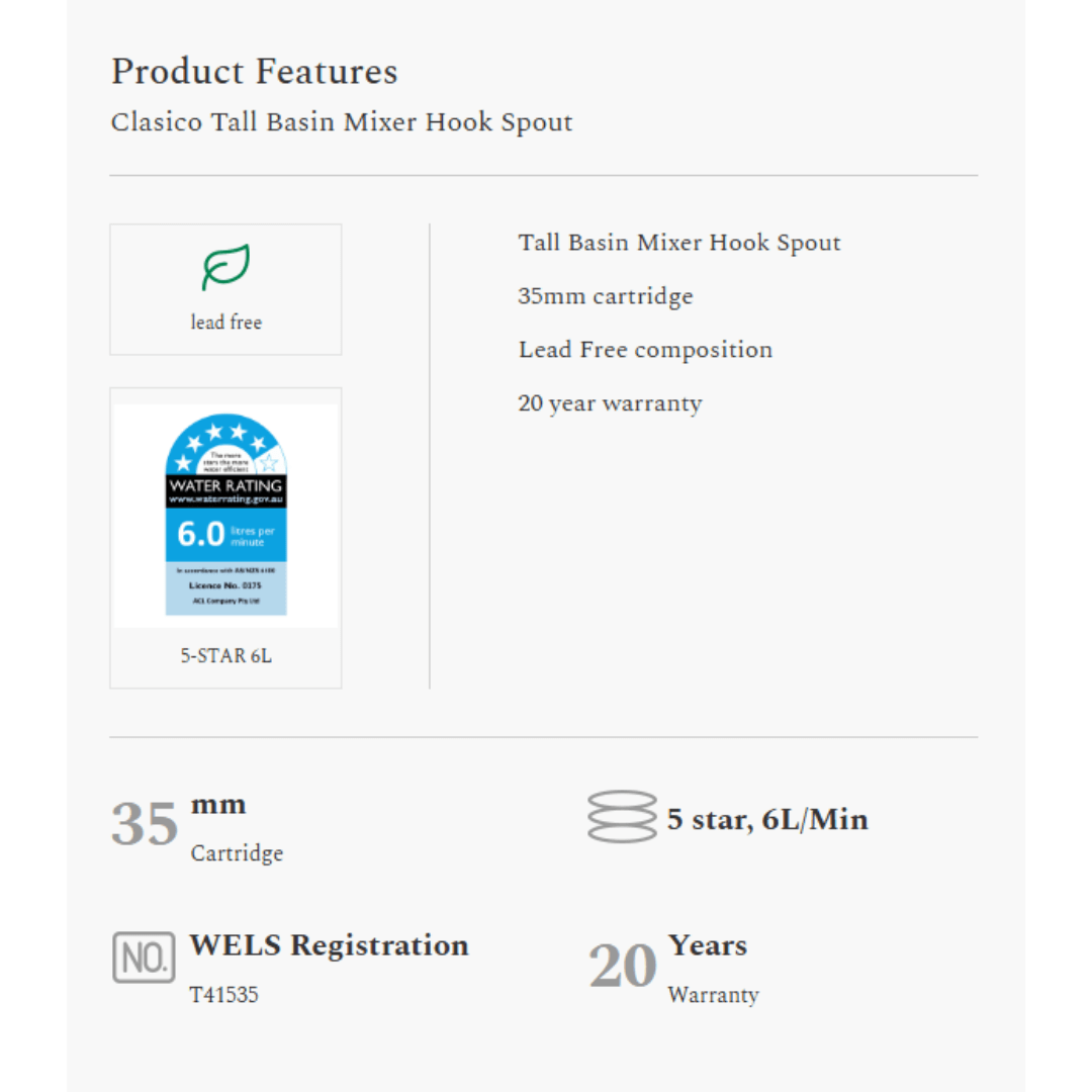 Clasico Tall Hook Spout Basin Mixer | Chrome