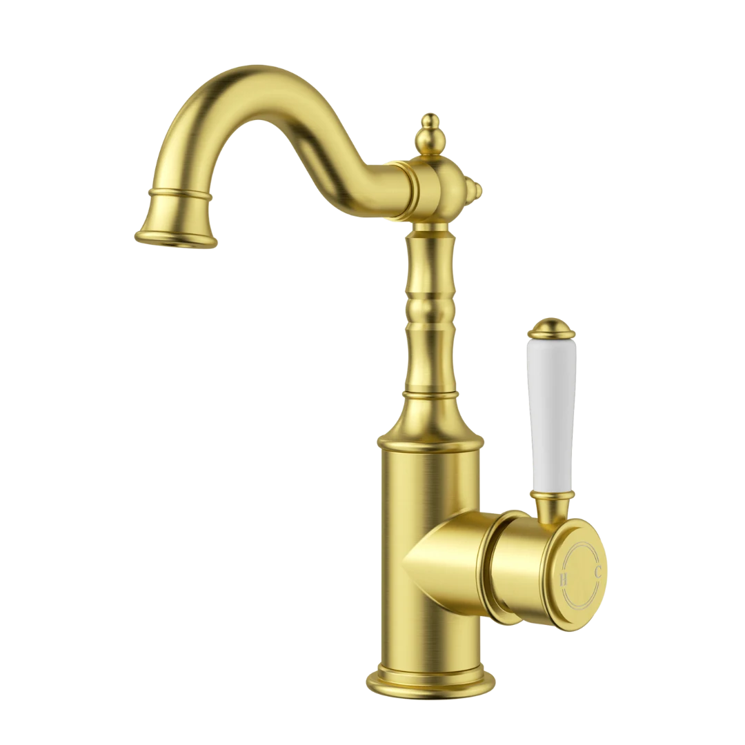 Clasico Tall Hook Spout Basin Mixer | Brushed Gold Ceramic Handle