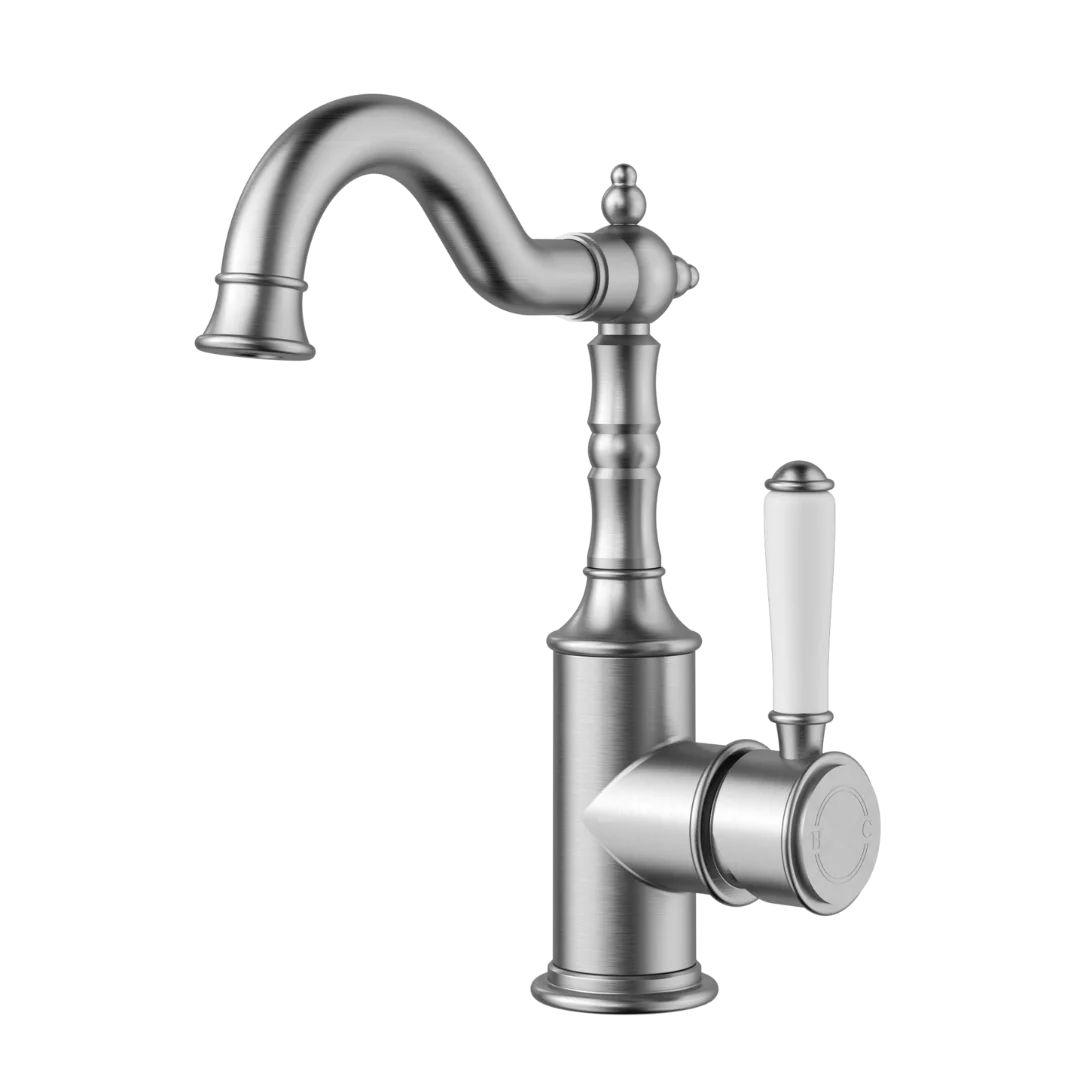 Clasico Tall Hook Spout Basin Mixer | Brushed Nickel Ceramic Handle